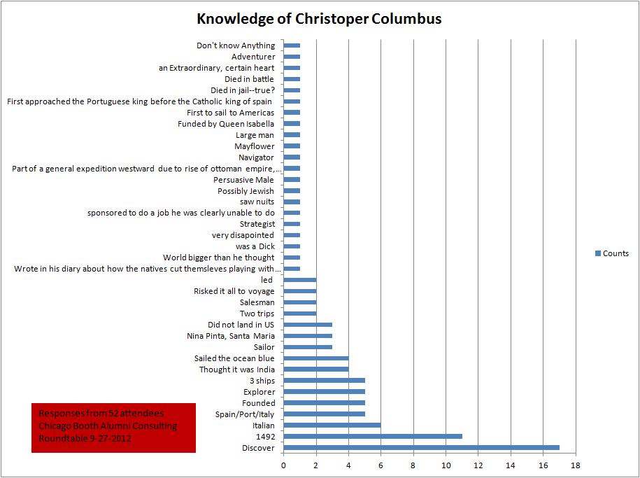 Does the variation in responses surprise you? It’s a simple story, isn’t it? Admittedly, Columbus had a long history so the enormous amount of possible facts to draw upon should produce lots of answers. The chart’s responses however provide some other points worth noting.